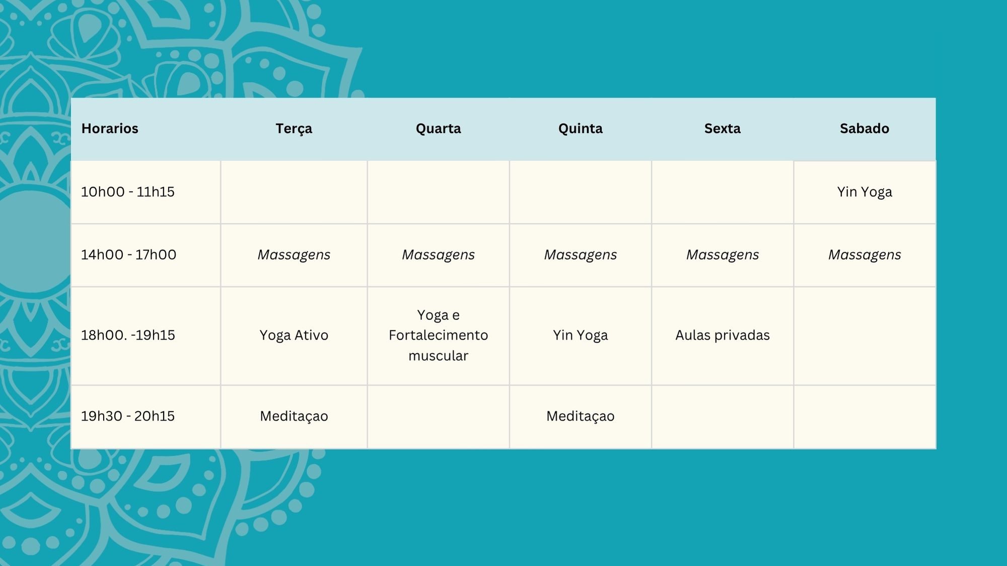 A nossa grade de horários conta com aulas regulares de Yoga e Meditação, essenciais para criar uma base sólida de saúde. Desde a energia do Vinyasa para flexibilidade e força, até à tranquilidade do Yin Yoga, todas as sessões culminam com uma Meditação guiada para centrar o foco e acalmar o sistema nervoso.